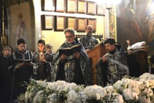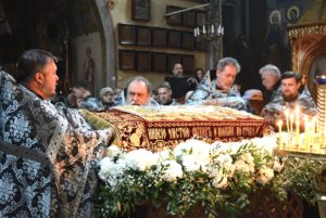 В конце вечерни, при пении тропаря «Благообразный Иосиф, с древа снем Пречистое Тело Твое», из алтаря на середину храма была перенесена Святая Плащаница с изображением погребения Христа.