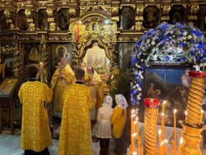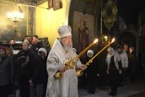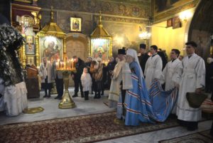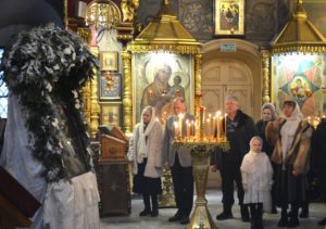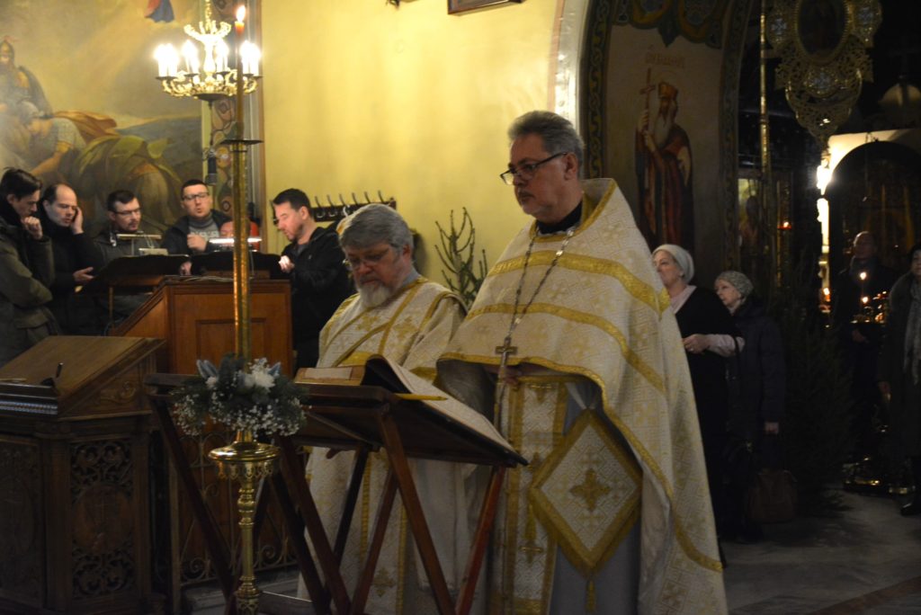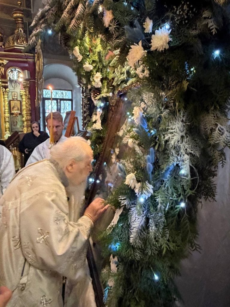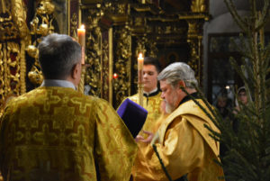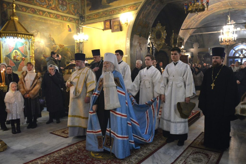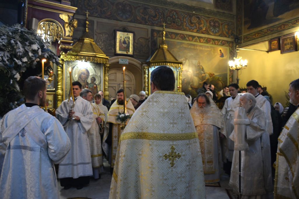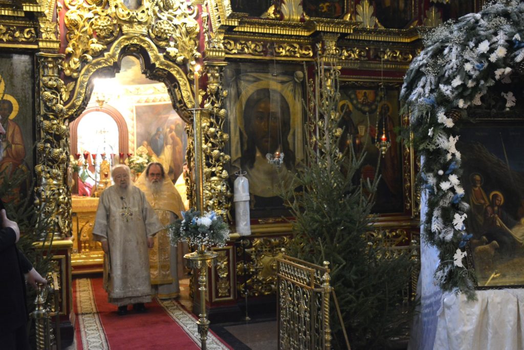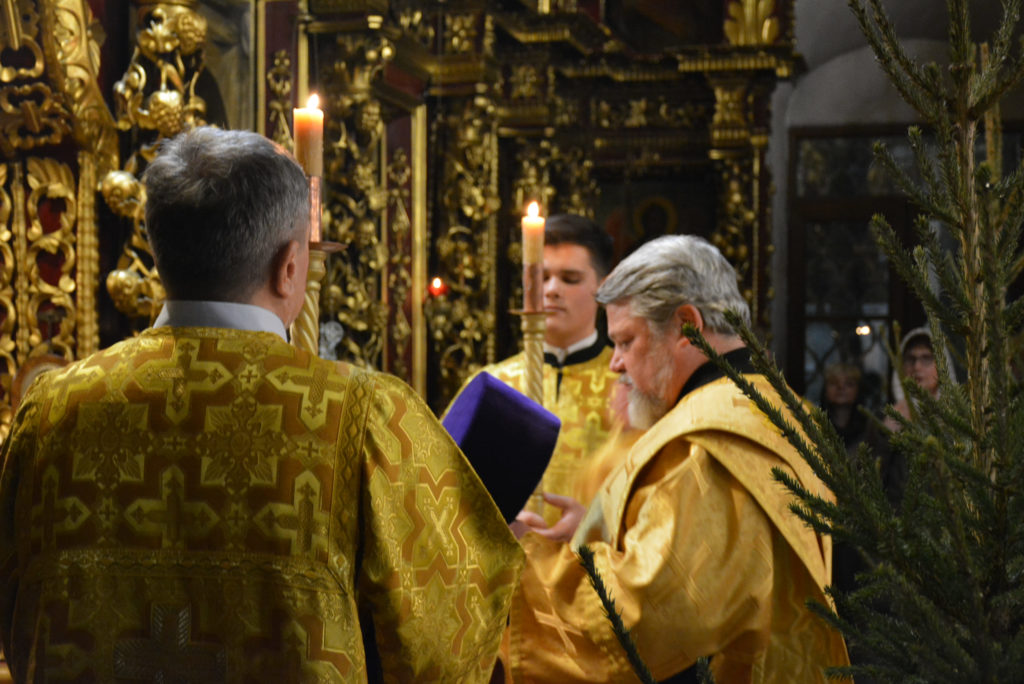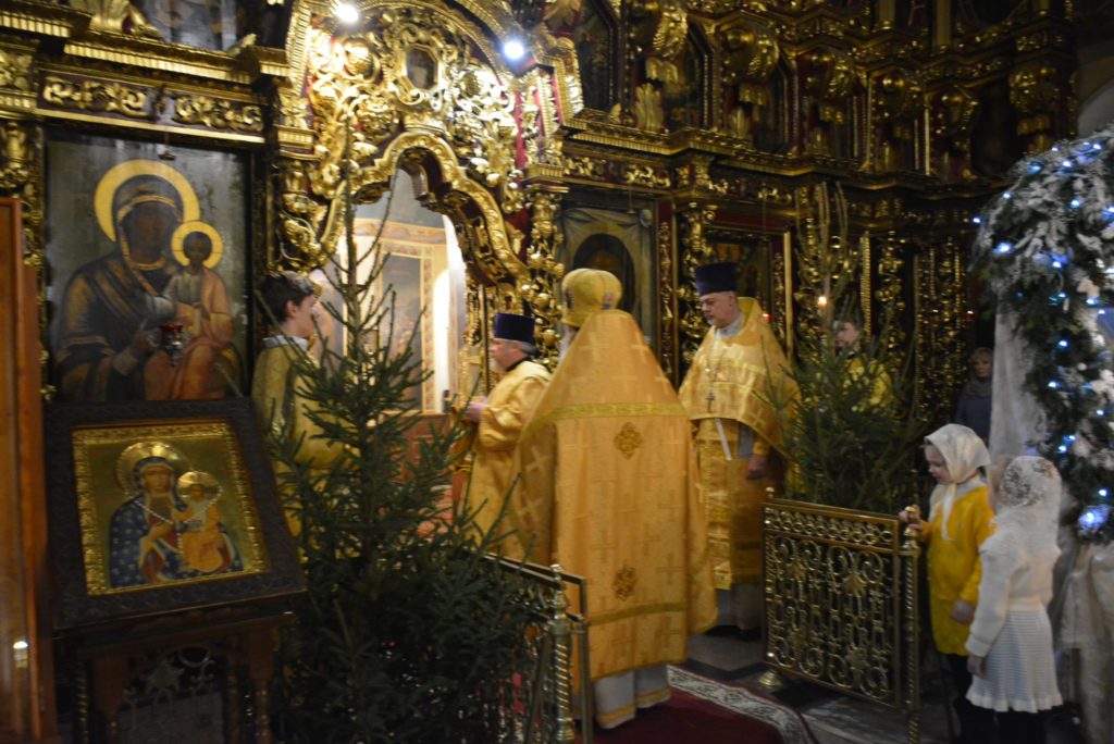 По отпусте Божественной литургии перед рождественской свечой, символизирующей Вифлеемскую звезду, были пропеты тропарь и кондак праздника Рождества Христова.